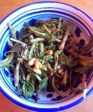 Побеги предварительно вымачиваются в кипящей воде в течение 3 минут, а затем слегка обжариваются в чесночном оливковом масле и добавляется немного кедровых орехов. Вкус блюда великолепен!